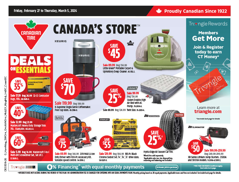 查看温哥华Canadian Tire 2026年2月27日 – 3月5日 的最新特价商品和优惠信息。不要错过这些超值优惠!